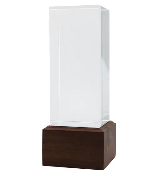 Thick crystal award fixed onto a solid walnut base. The Alexandra Crystal Award comes in three sizes, making this the perfect option for an incredibly versatile stunning corporate award.