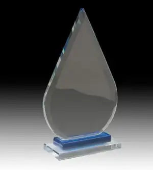 The Duke Glass Award Clear glass teardrop shaped award with bevelled front edge set on a blue and clear glass pedestal base. The Duke comes in three sizes, making this the perfect option for an incredibly versatile cost-effective corporate award.