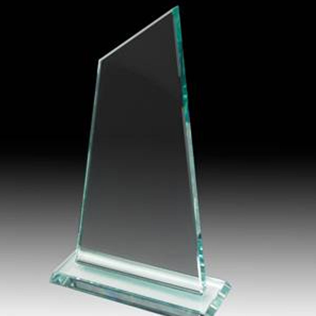 The Peak Glass Jade coloured award with a slanted top edge base. The Peak Award comes in three sizes, making this the perfect option for an incredibly versatile cost-effective corporate award.